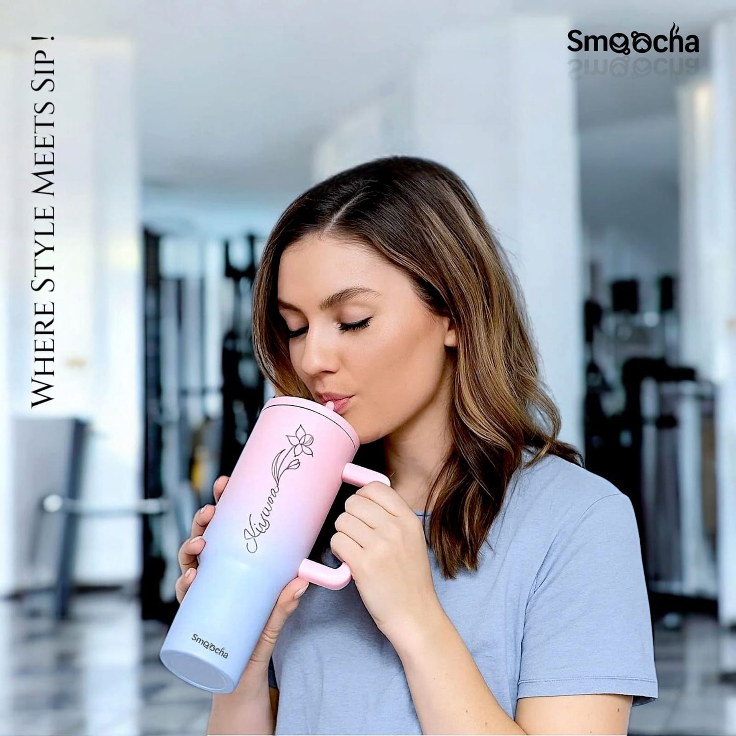 Stay refreshed all day with our 40 oz (1200 ml) stainless steel customized pink and Blue tumbler with name and emoji. Whether you're commuting, traveling, or working from home, this stylish tumbler keeps your drinks cold for up to 11 hours, hot for 7 hours, and iced for 20 hours. It's designed with a 3-way lid (sip, gulp, or close) and comes with a reusable straw for easy drinking.
